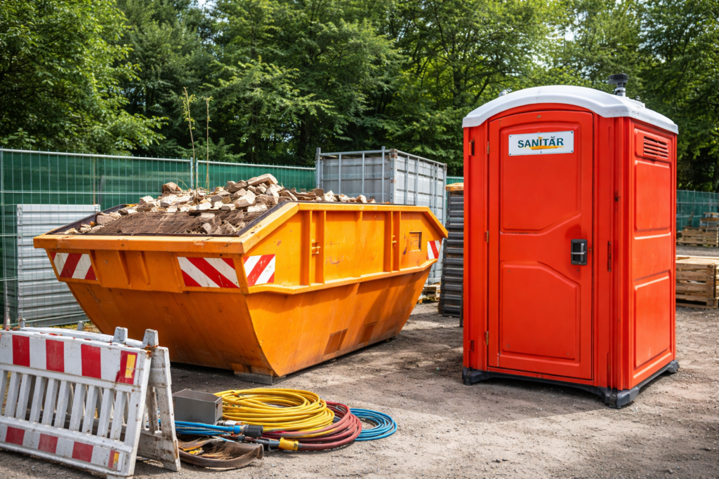 Von Containern inkl. Abholung und Entsorgung bis zu Bauzäunen und mobilen Toiletten – wir stellen Ihre Baustelle vollständig bereit. Alles zentral organisiert, effizient abgestimmt und reibungslos integriert.